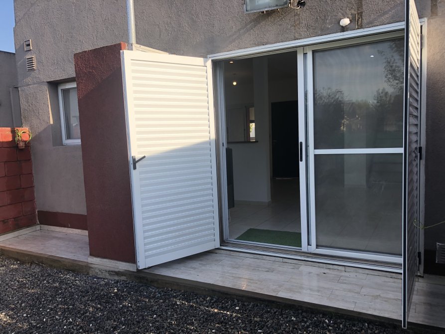 Living al frente y Estar Comedor con ventana balcón al fondo con postigon de aluminio y estufa de tiro balanceado